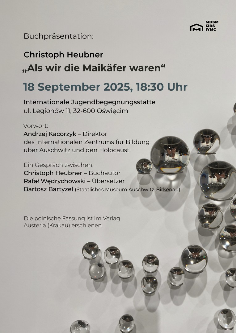 Am 18. September um 18.30 Uhr findet in der Internationalen Jugendbegegnungsstätte in Oświęcim (ul. Legionów 11, Oświęcim) ein Treffen mit Christoph Heubner, dem Autor des Buches „Als wir die Maikäfer waren”, und Rafał Wędrychowski, dem Übersetzer der polnischen Ausgabe, statt. An dem Gespräch wird auch Bartosz Bartyzel teilnehmen, Pressesprecher und Leiter der Pressestelle des Staatlichen Museums Auschwitz-Birkenau, Vorstandsmitglied der Stiftung für das Internationale Jugendbegegnungsstätte in Oświęcim/Auschwitz. Das Vorwort hält Andrzej Kacorzyk, Direktor des Internationalen Zentrums für Bildung über Auschwitz und den Holocaust.